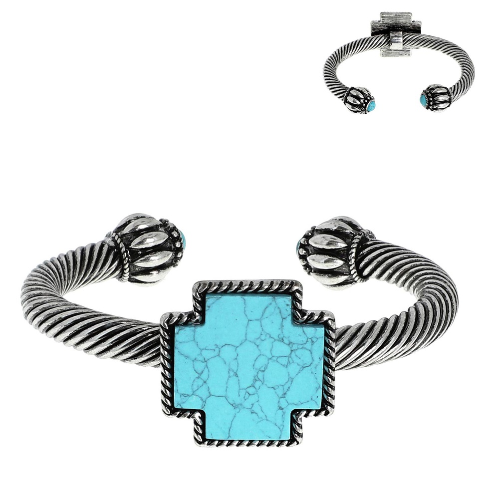 WESTERN TURQUOISE SEMI STONE CROSS DOUBLET CABLE CUFF BRACELET IN OXIDIZED SILVER TONE METAL
