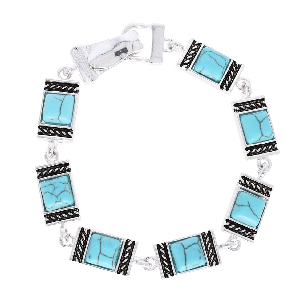 WESTERN SQUARE CUT TURQUOISE SEMI STONE LINK BRACELET WITH MAGNETIC CLOSURE IN OXIDIZED SILVER TONE METAL