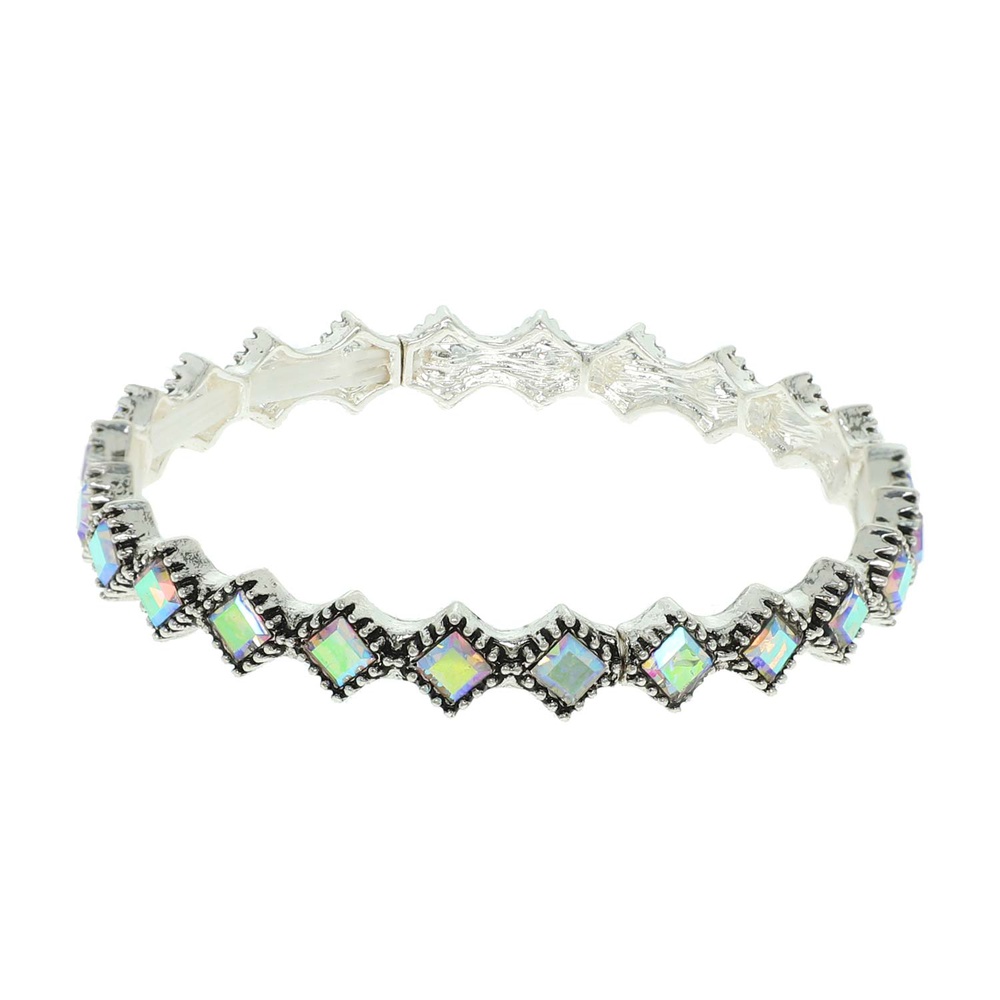 VINTAGE WESTERN DIAMOND CUT TURQUOISE AB CRYSTAL GEMSTONE NATURAL SEMI STONE STRETCH BANGLE BRACELET IN OXIDIZED SILVER TONE METAL