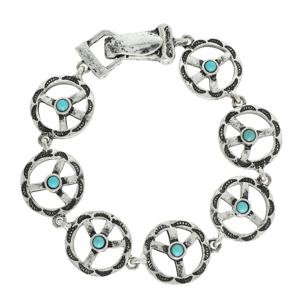 WESTERN PEACE SIGN TURQUOISE SEMI STONE LINK BRACELET WITH MAGNETIC CLOSURE IN OXIDIZED SILVER TONE METAL