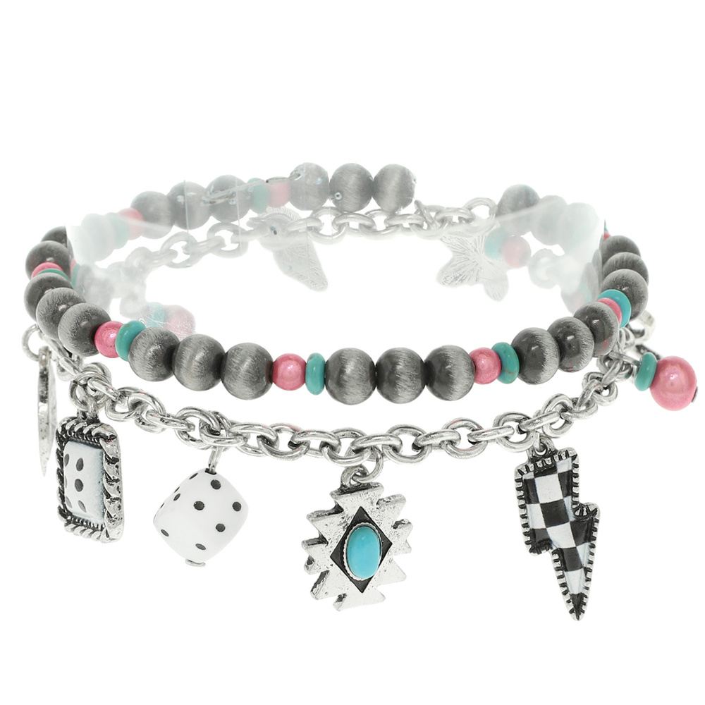 WESTERN GAMBLING THEME TURQUOISE EMBELLISHED MULTI-CHARM BEAD BRACELET