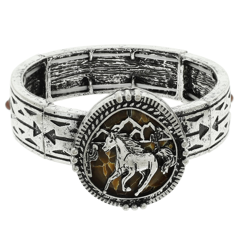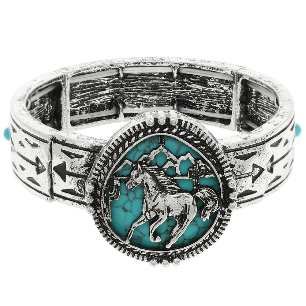 COLORED TURQUOISE EMBELLISHED HORSE STRETCH BRACELET IN SILVER-TONE OXIDIZED METAL