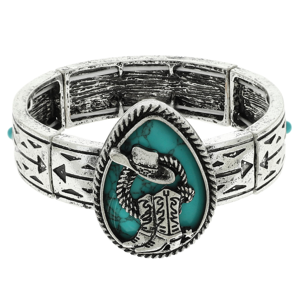 TEARDROP BLUE TURQUOISE SET HAT & BOOT STRETCH BRACELET IN SILVER-TONE OXIDIZED METAL
