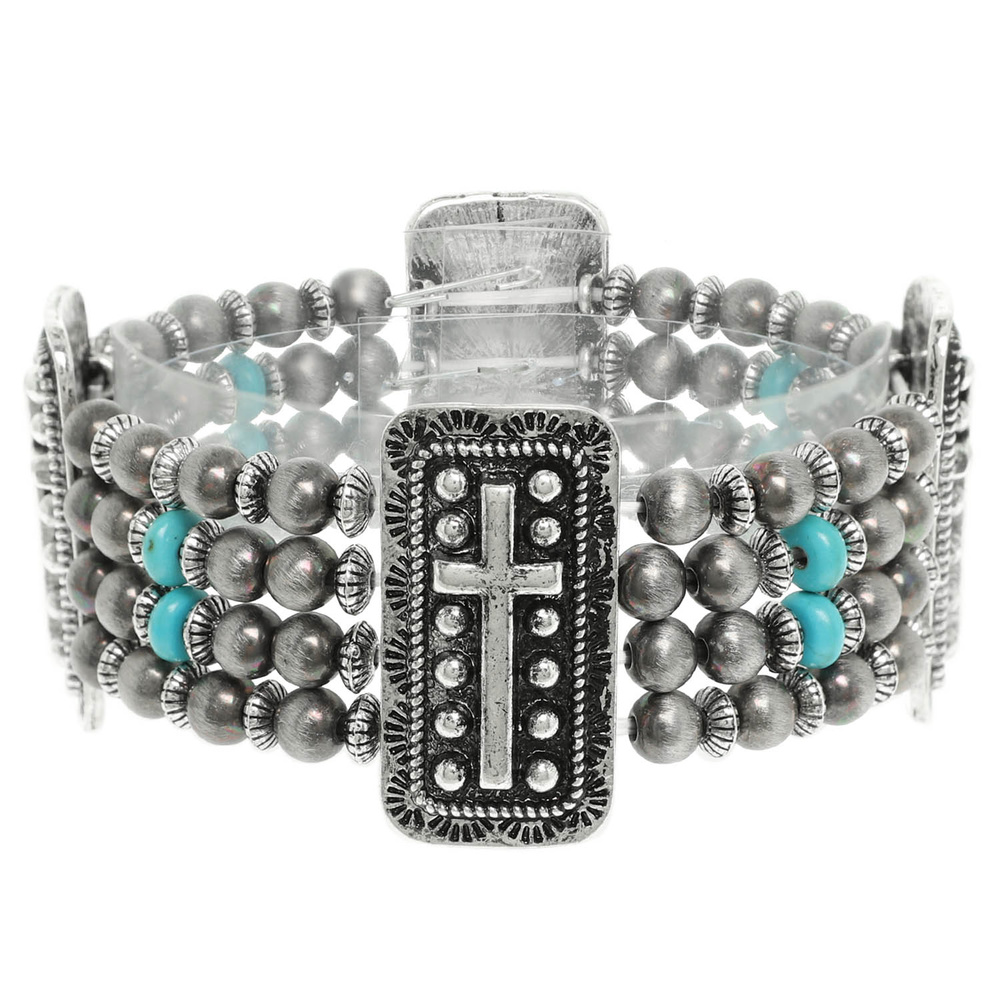 STRETCH BRACELET WITH RECTANGLE CROSS CONCHO AND TURQUOISE ACCENT BEADS