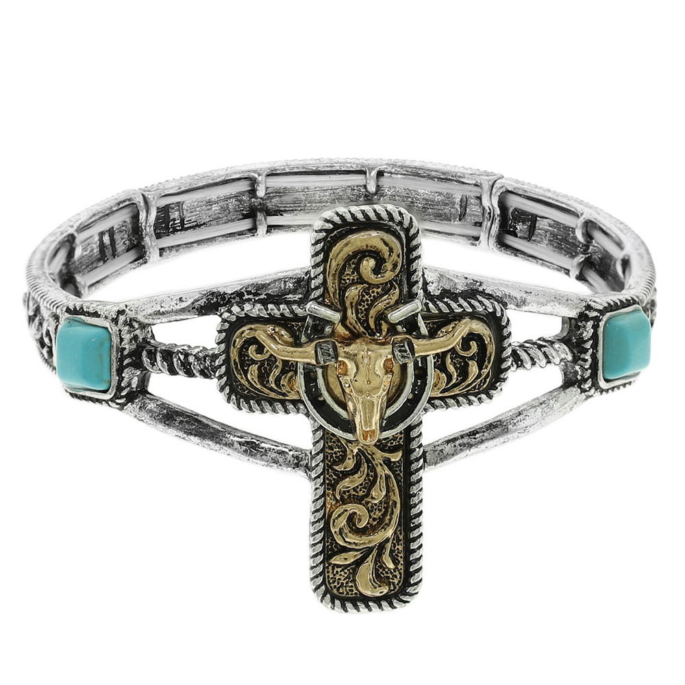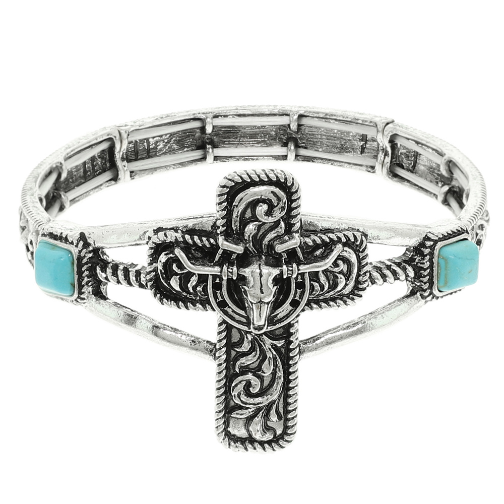 WESTERN FILIGREE STEERHEAD CROSS STRETCH BRACELET WITH TURQUOISE