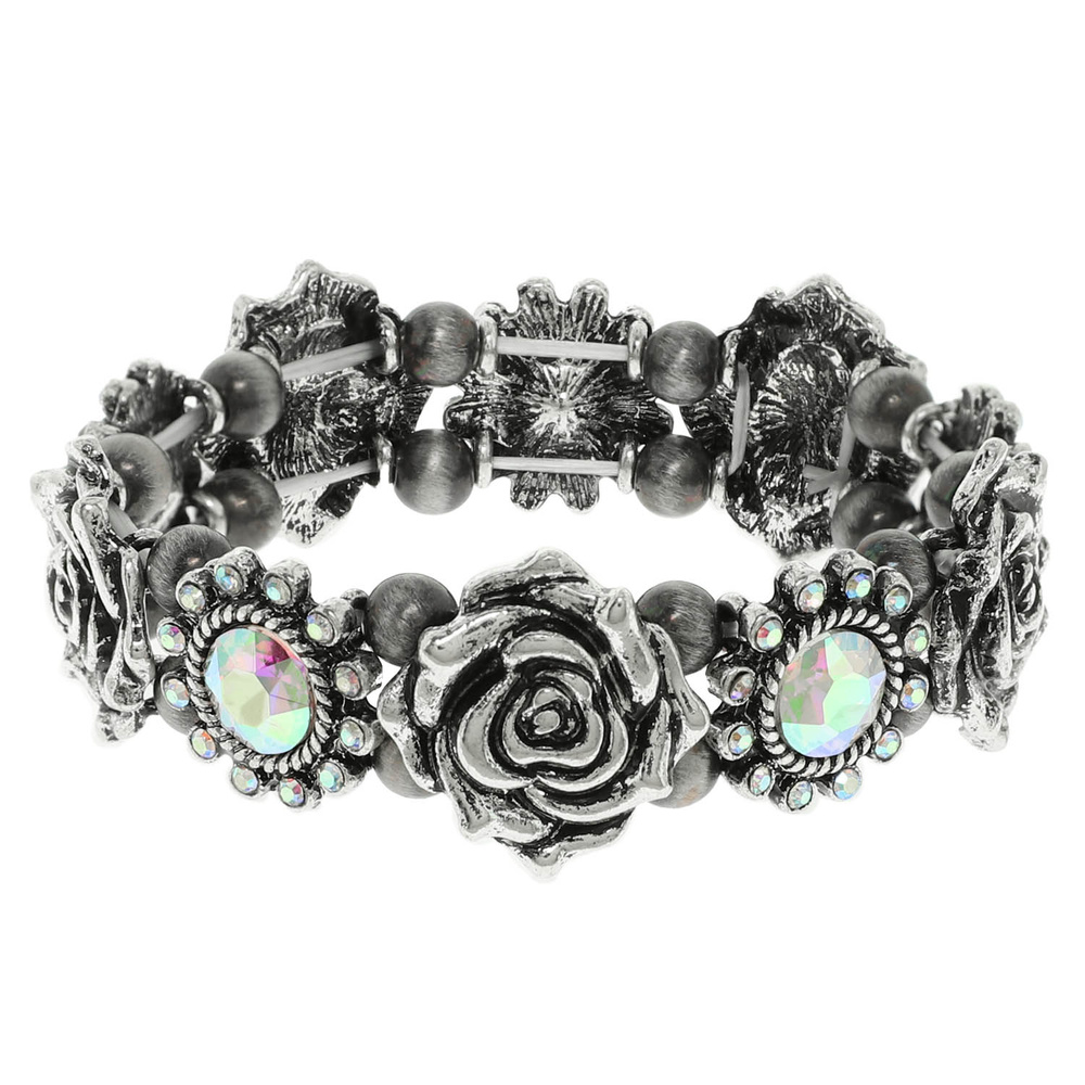 ROSE STRETCH BRACELET IN OXIDIZED SILVER TONE METAL WITH CRYSTAL ACCENTS