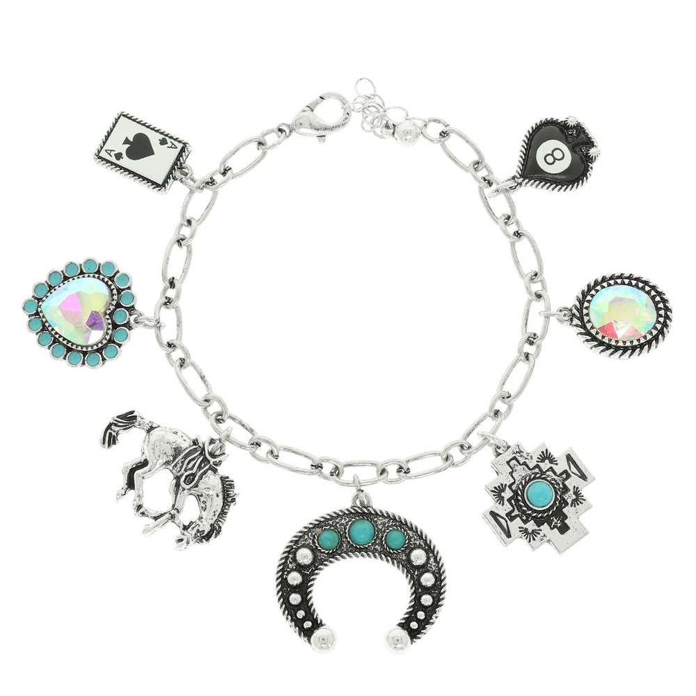 WESTERN CHARM BRACELET IN OXIDIZED SILVER TONE METAL WITH HORSESHOE TURQUOISE HEART CARD SUIT CHARMS