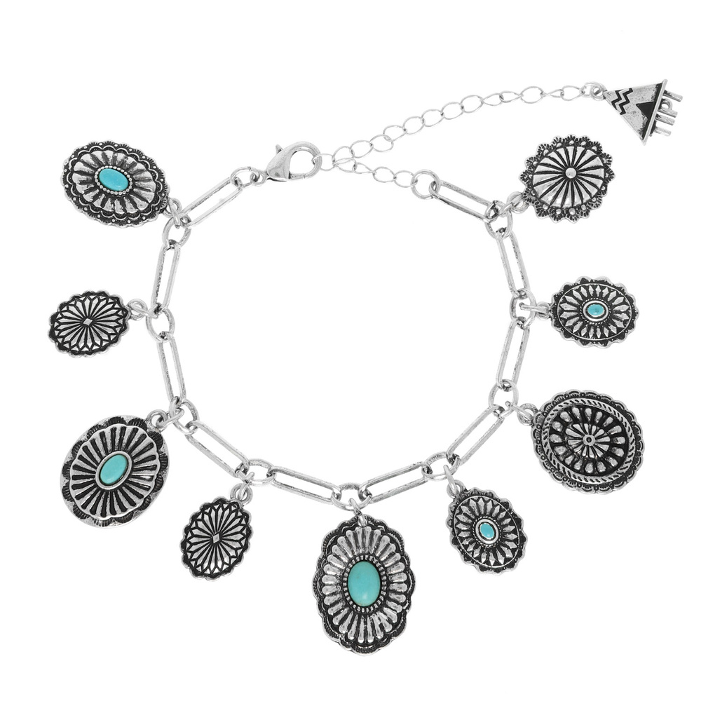 WESTERN TURQUOISE SQUASH BLOSSOM CHARM LINK BRACELET IN OXIDIZED SILVER TONE METAL