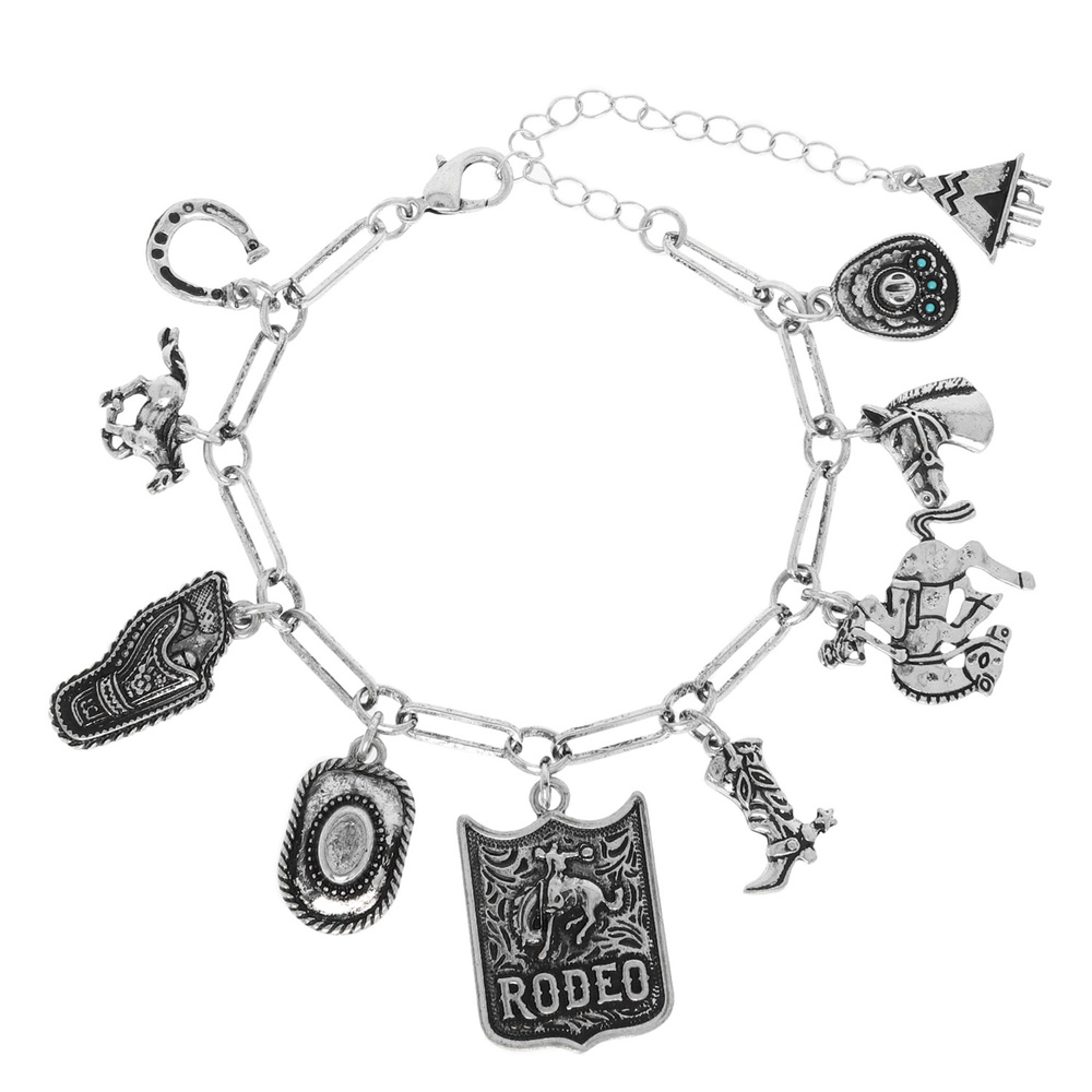 WESTERN RODEO CHARM LINK BRACELET IN OXIDIZED SILVER TONE METAL