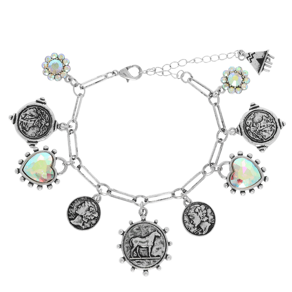 WESTERN COIN CRYSTAL CHARM BRACELET WITH HEART AND FLORAL TRINKETS