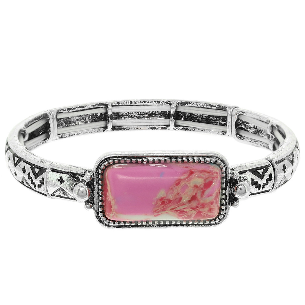WESTERN RECTANGLE STONE BAR STRETCH BRACELET WITH AZTEK ENGRAVED BAND