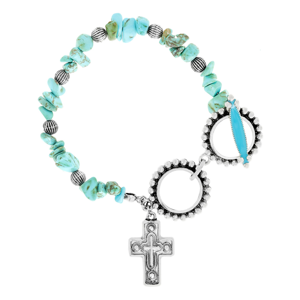 Cross Western Style Charm Pebble Turquoise Bead Toggle Bracelet