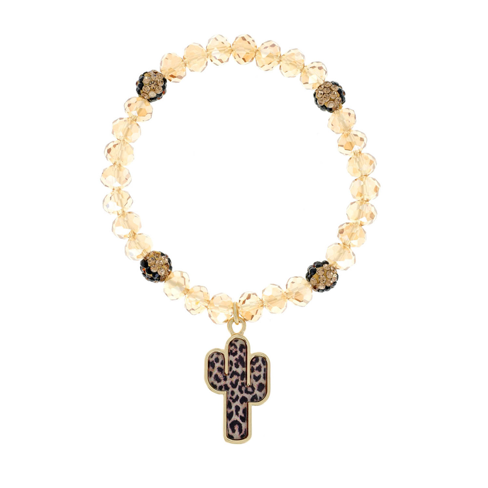 WESTERN LEOPARD CHEETAH CACTUS CHARM RHINESTONE BALL AND BEAD STRETCH BRACELET