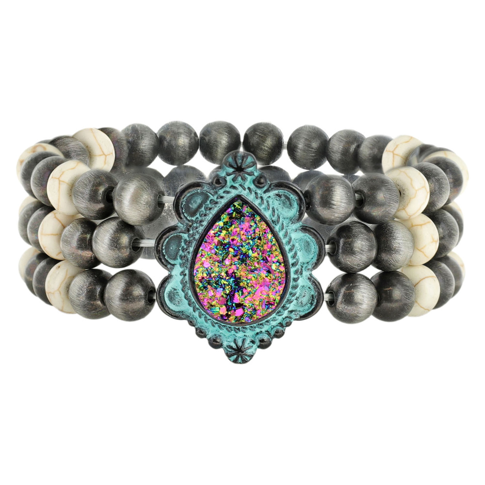 Western 3 Row Navajo Bead Stretch Bracelet With Faux Druzy Center