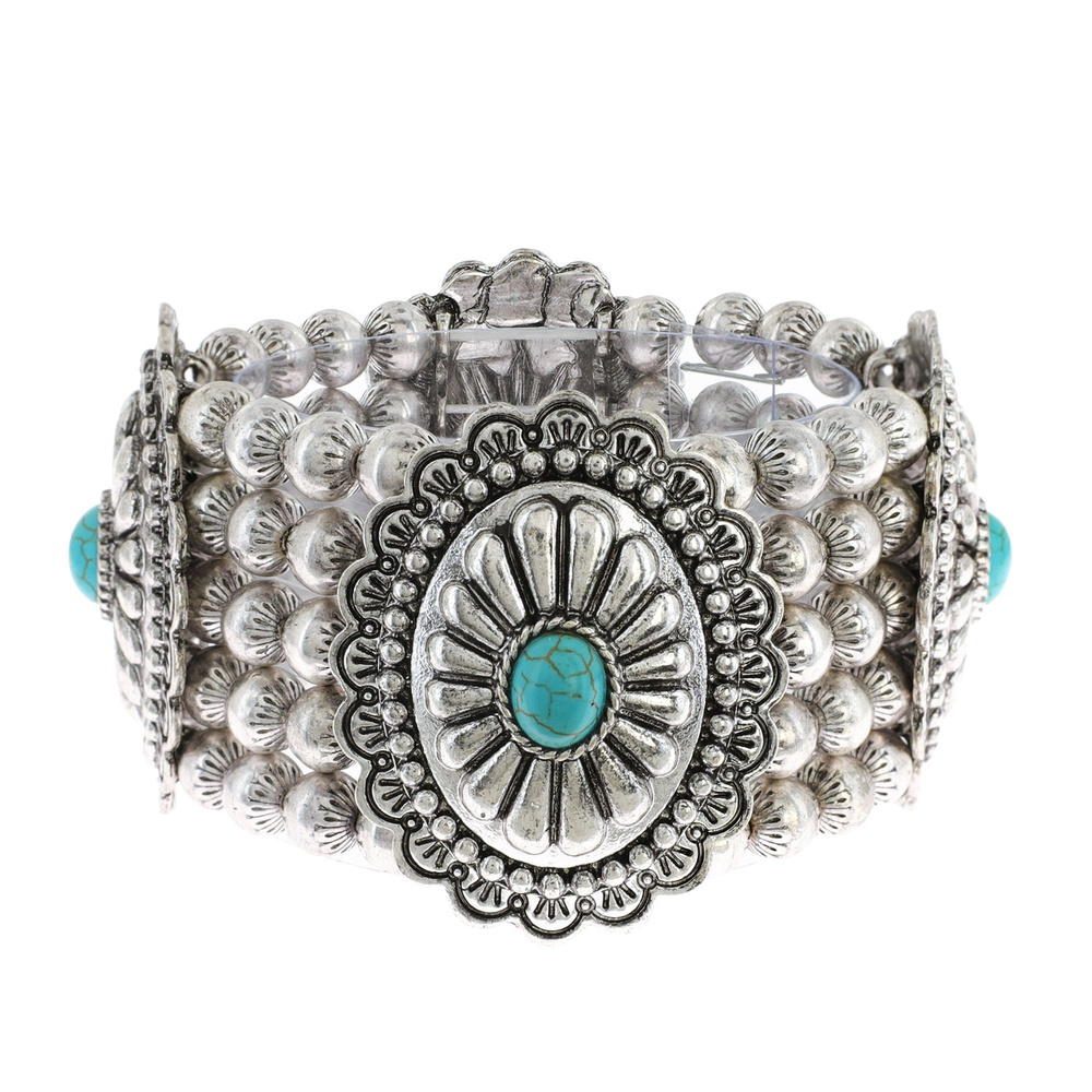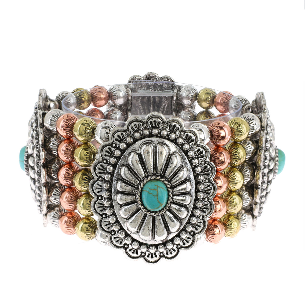 Vintage Western Style Multi Row Metallic Beaded Turquoise Concho Stretch Bracelet
