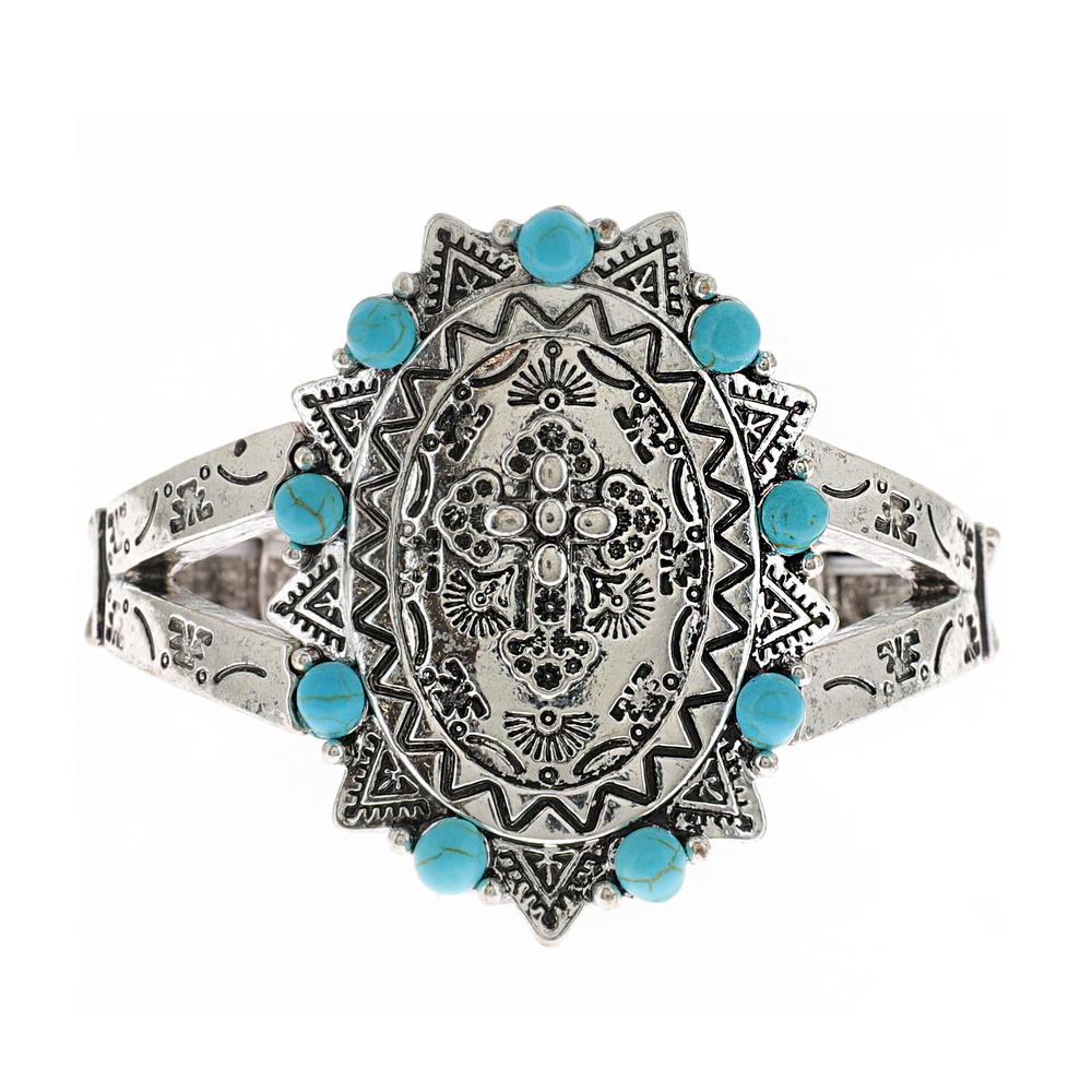 CROSS -WESTERN TURQUOISE SYNTHETIC SEMI STONE ENGRAVED DESIGN ADJUSTABLE BANGLE CUFF BRACELET