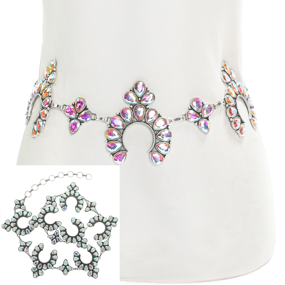 CRYSTAL EMBELLISHED SQUASH BLOSSOM CHAIN LINK BELT IN SILVER-TONE METAL