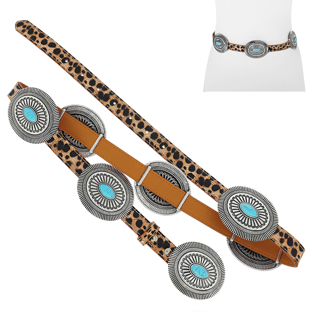 BLACK/BROWN/ LEOPARD PRINT-WESTERN PU LEATHER SYNTHETIC SEMI STONE TURQUOISE SUNBURST CONCHO BELT