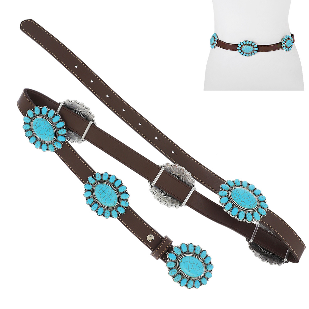 BLACK/BROWN/ LEOPARD PRINT/ SERAPE PRINT - WESTERN PU LEATHER SYNTHETIC SEMI STONE TURQUOISE CONCHO BELT