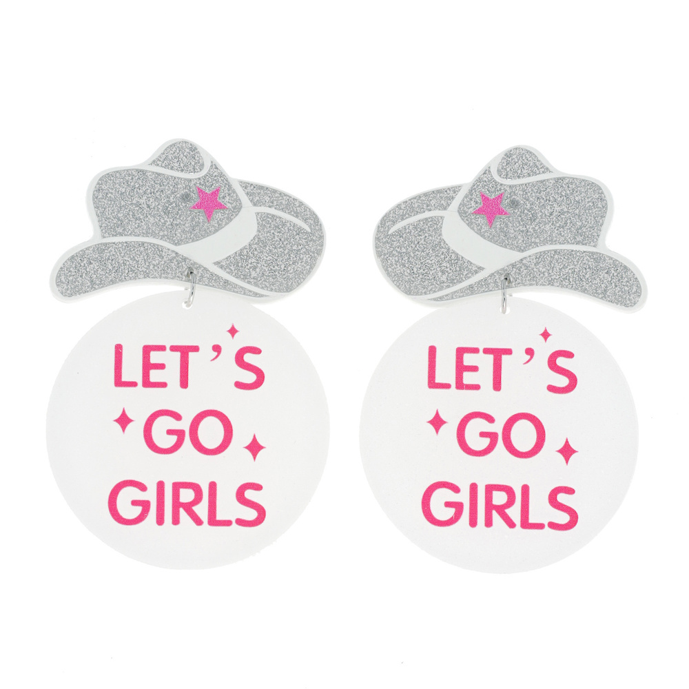 2-tier Glitter Cowboy Hat "let's Go Girls" Dangle And Drop Novelty Earrings