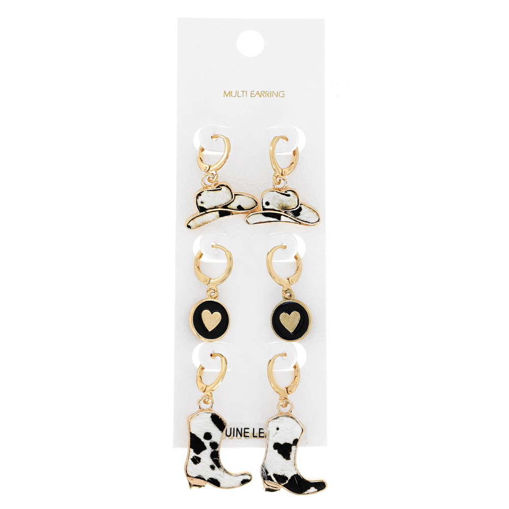 3-pair Assorted Cowhide Print Western Themed Enamel Coated Earring Set