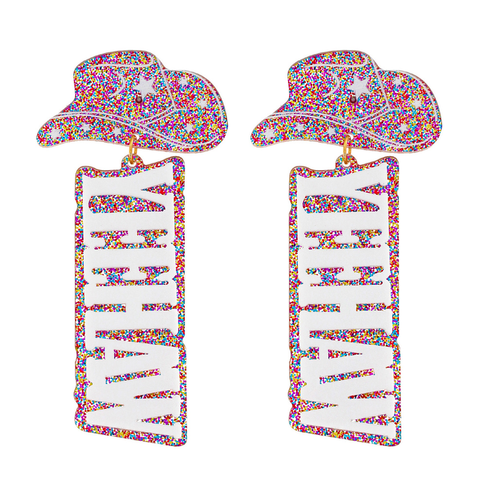 2-tier Cowboy Hat "yeehaw" Long Drop Novelty Glitter Earrings