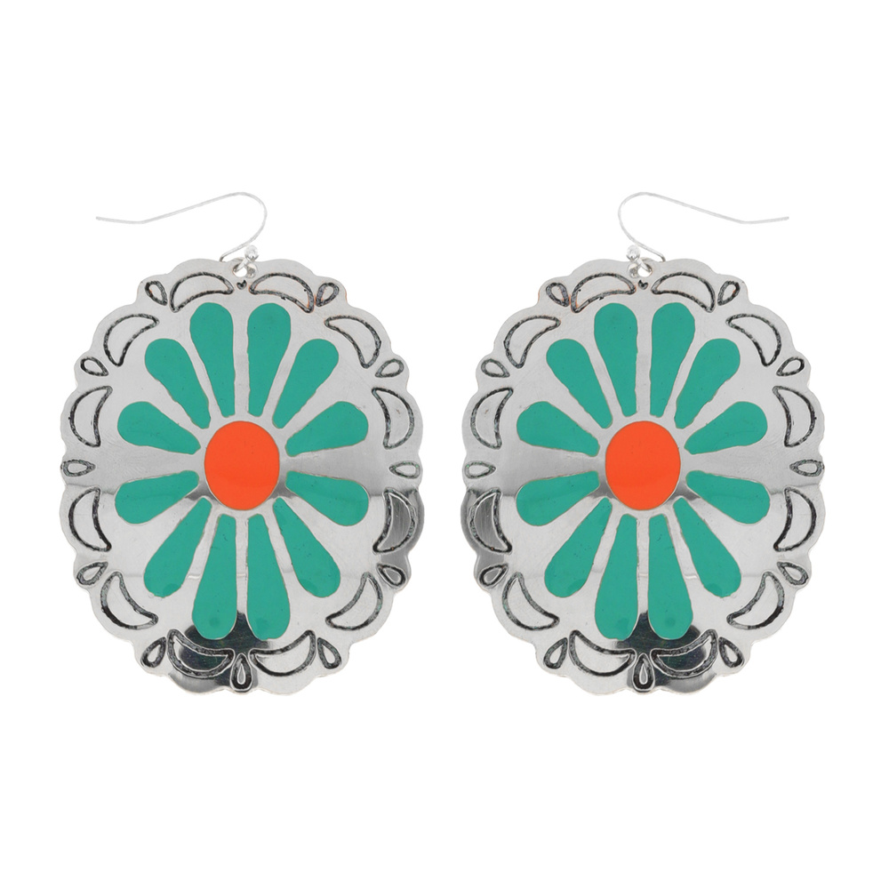 SOUTHWESTERN 2-TIER SCALLOPED OVAL ENAMEL COATED DANGLE AND DROP HOOK EARRINGS