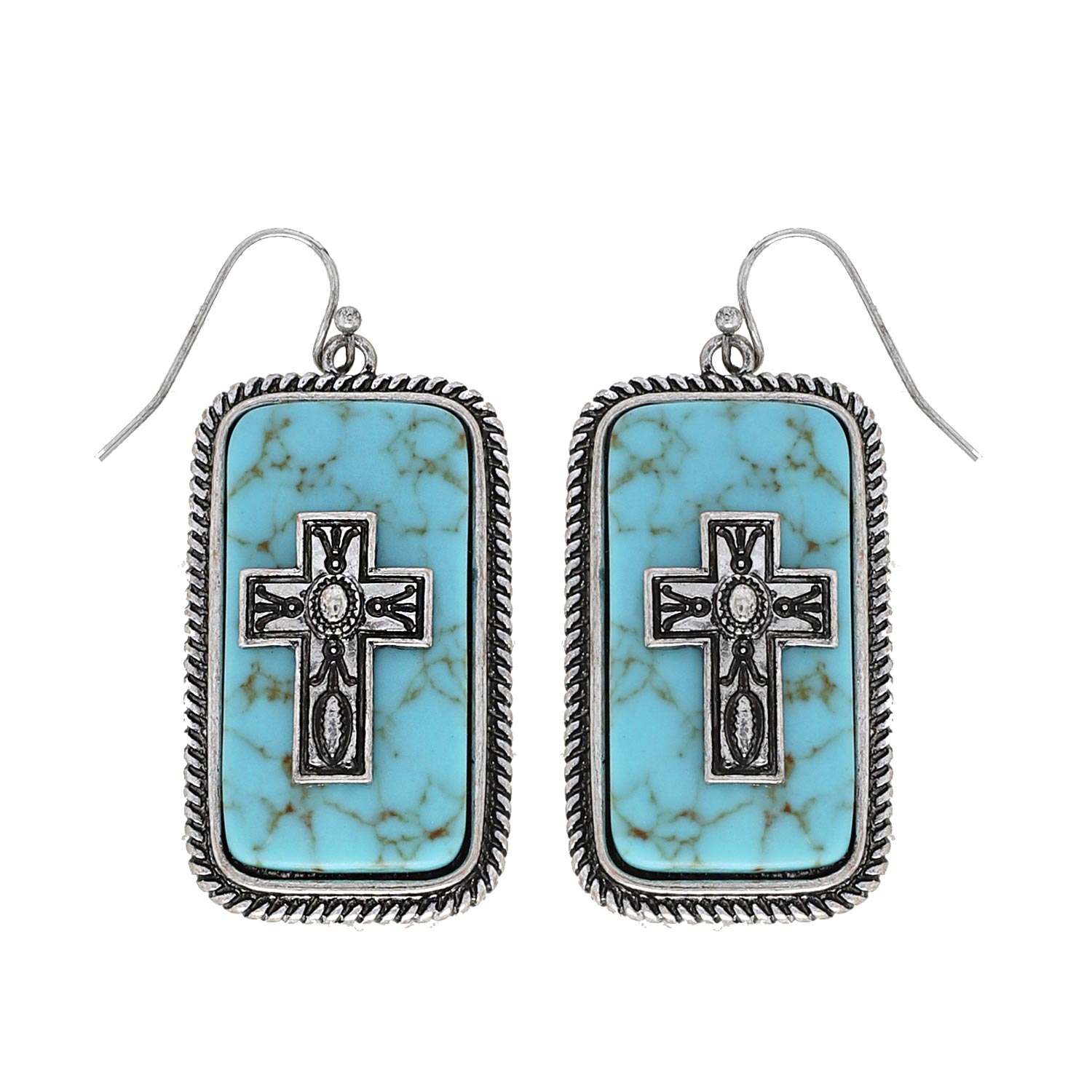 Cross Turquoise Semi Stone Rope Trim Rectangular Earrings