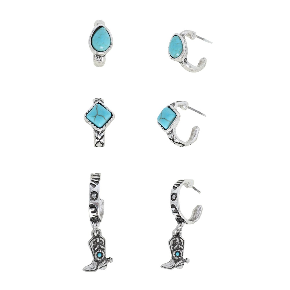 Western 3-piece Turquoise Semi Stone Assorted Open Hoop Earring Set