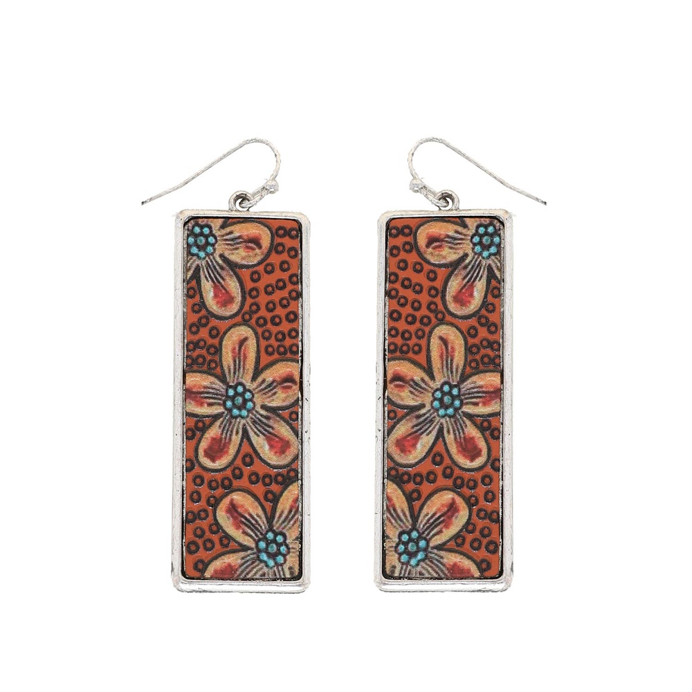WESTERN FLORAL RECTANGULAR DANGLE AND DROP HOOK LEATHER EARRINGS