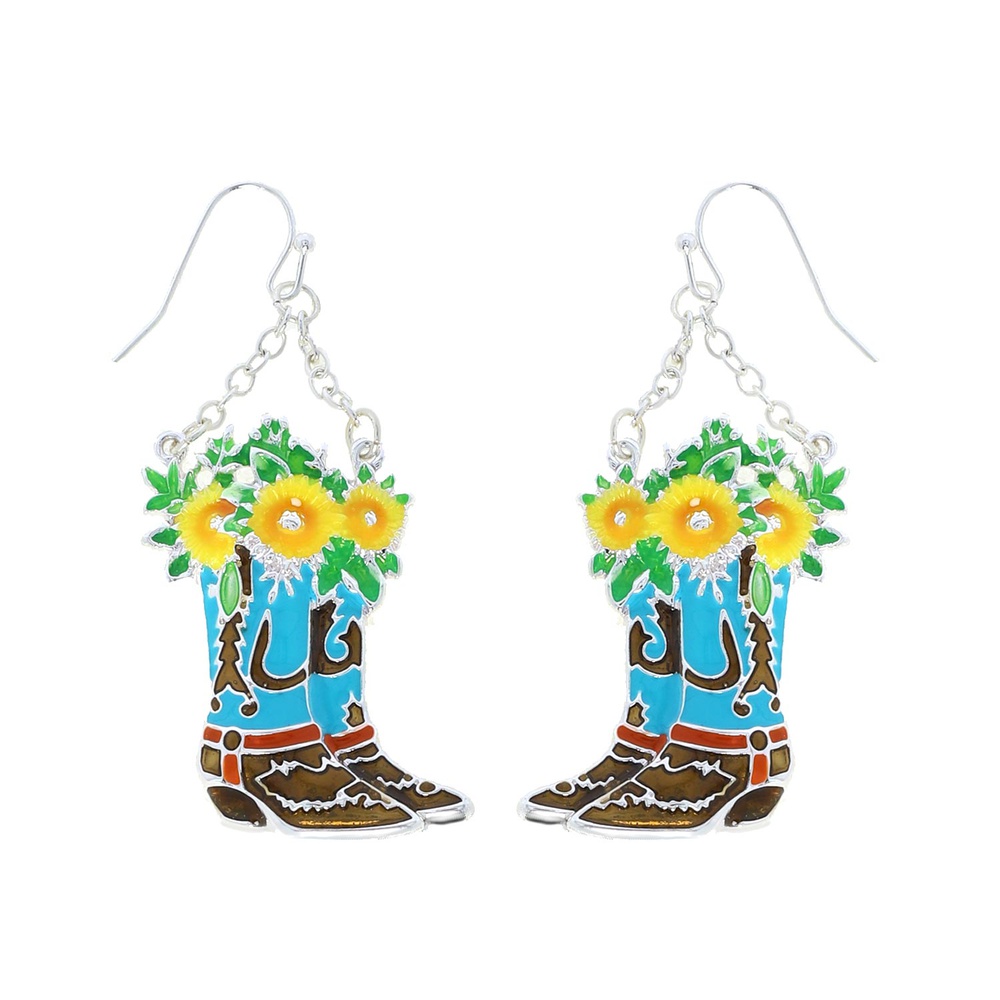 WESTERN ENAMEL COATED SUNFLOWER CHAINED COWBOY BOOTS DANGLE AND DROP HOOK EARRINGS