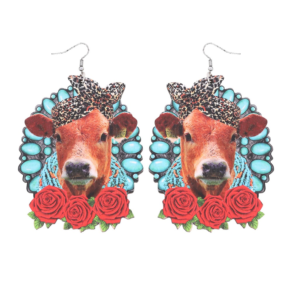 WESTERN LEOPARD PRINT FLORAL COW LONG DROP WOODEN FISH HOOK EARRINGS IN SILVER TONE METAL