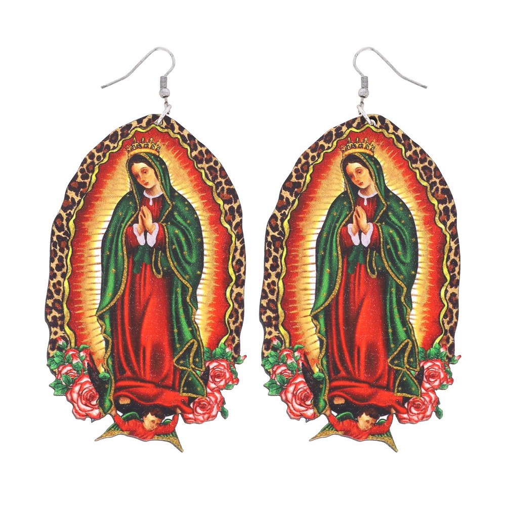 WESTERN LEOPARD PRINT LADY GUADALUPE LONG DROP WOODEN FISH HOOK EARRINGS IN SILVER TONE METAL
