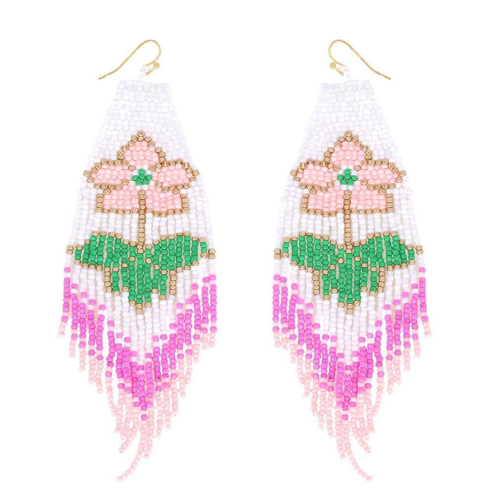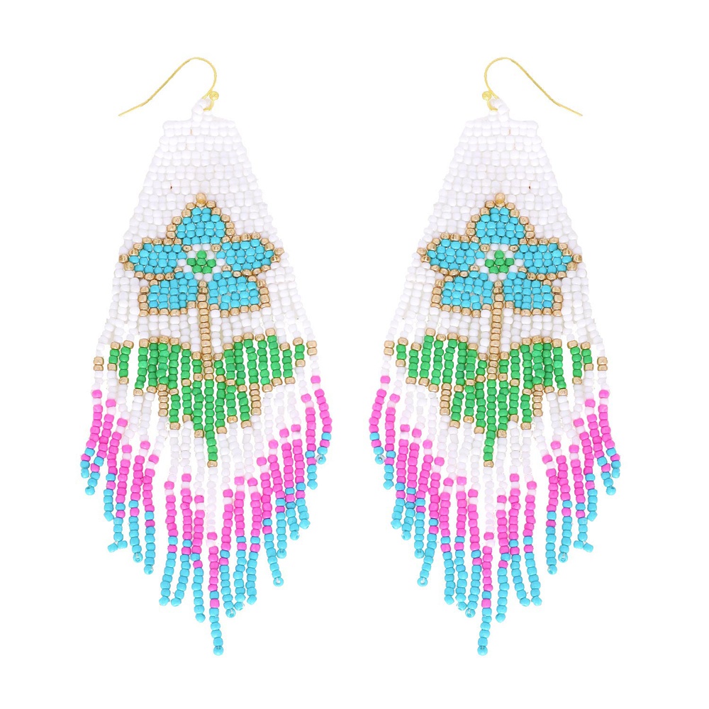 NATIVE AMERICAN FLORAL PATTERN BEADED LONG DROP TASSEL HOOK EARRINGS