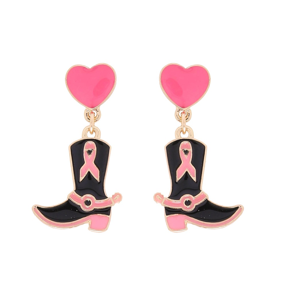 2-TIER WESTERN COWBOY BOOT BREAST CANCER AWARENESS PINK RIBBON ENAMEL COATED DANGLE AND DROP EARRINGS