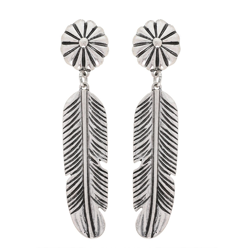 WESTERN FLORAL POST FEATHER LONG DROP EARRINGS IN OXIDIZED SILVER TONE METAL