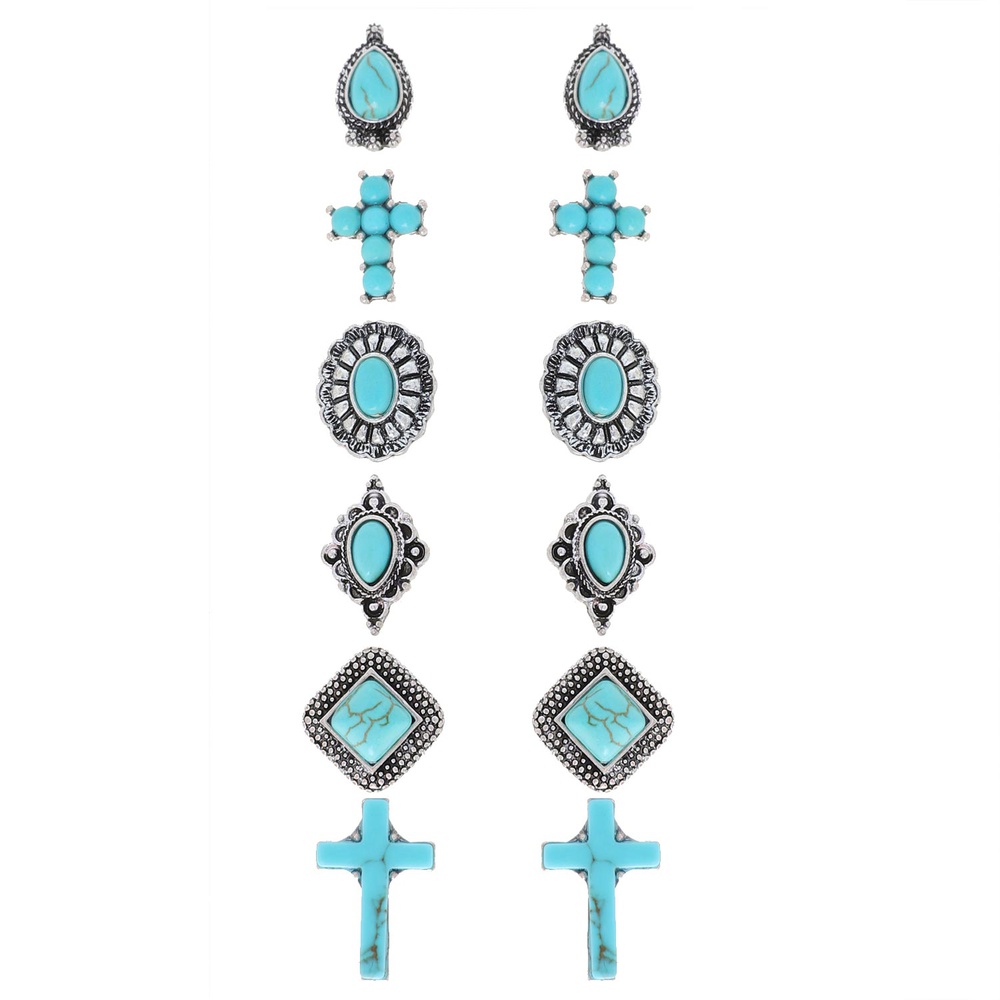 6-PAIR WESTERN TURQUOISE SEMI STONE CROSS ASSORTED STUD EARRING SET