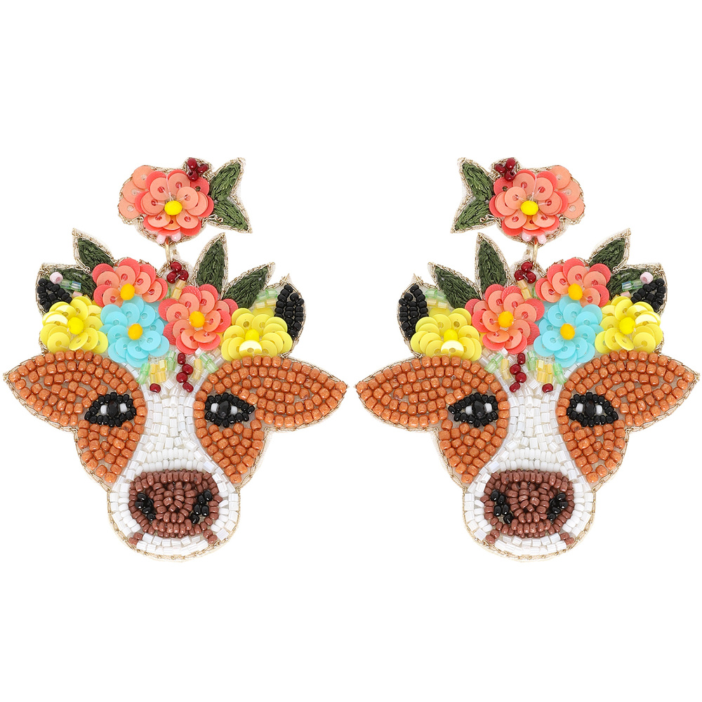 2-TIER FARM ANIMAL FLORAL DAIRY COW BEADED EMBROIDERY DANGLE AND DROP EARRINGS