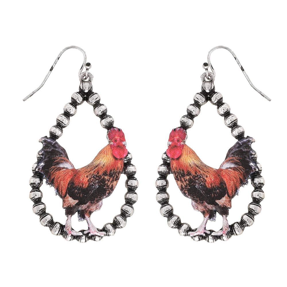 VINTAGE WESTERN BALL TRIM OPEN TEARDROP ROOSTER CUTOUT DANGLE AND DROP FISH HOOK EARRINGS IN OXIDIZED SILVER TONE METAL
