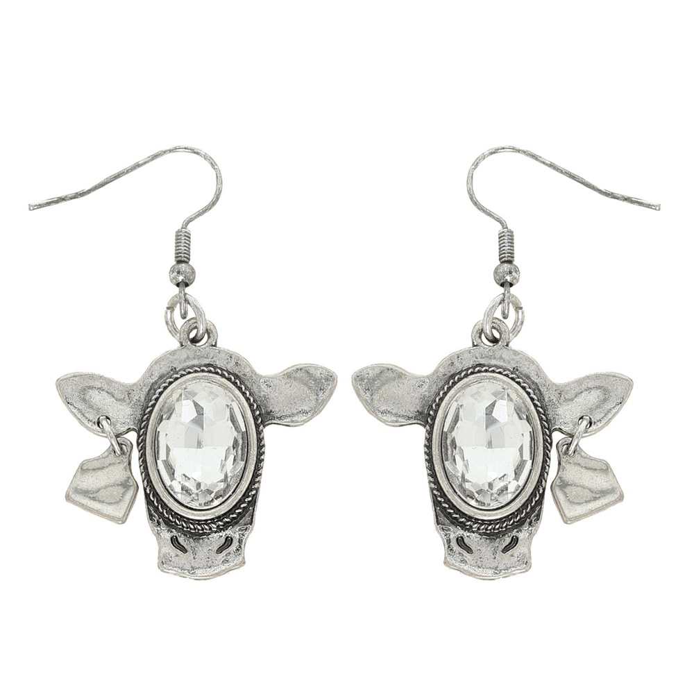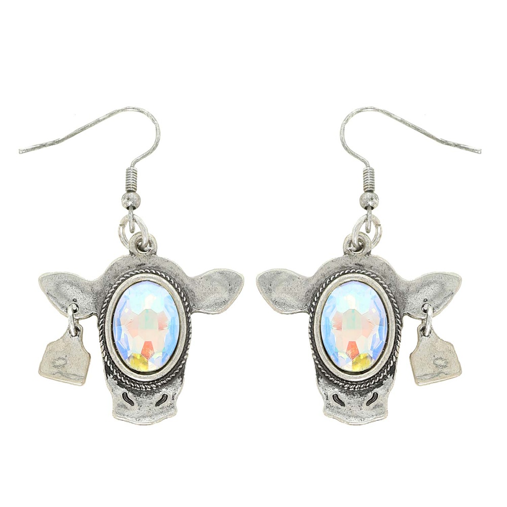 WESTERN CATTLE TAG COW AB CRYSTAL GEMSTONE ROPE TRIM FISH HOOK DROP EARRINGS IN OXIDIZED SILVER TONE METAL