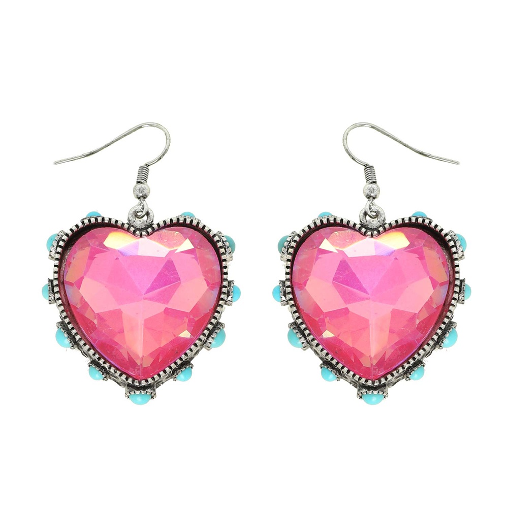 WESTERN HEART SHAPED CRYSTAL GEMSTONE TURQUOISE SEMI STONE FISH HOOK DROP EARRINGS IN OXIDIZED SILVER TONE METAL