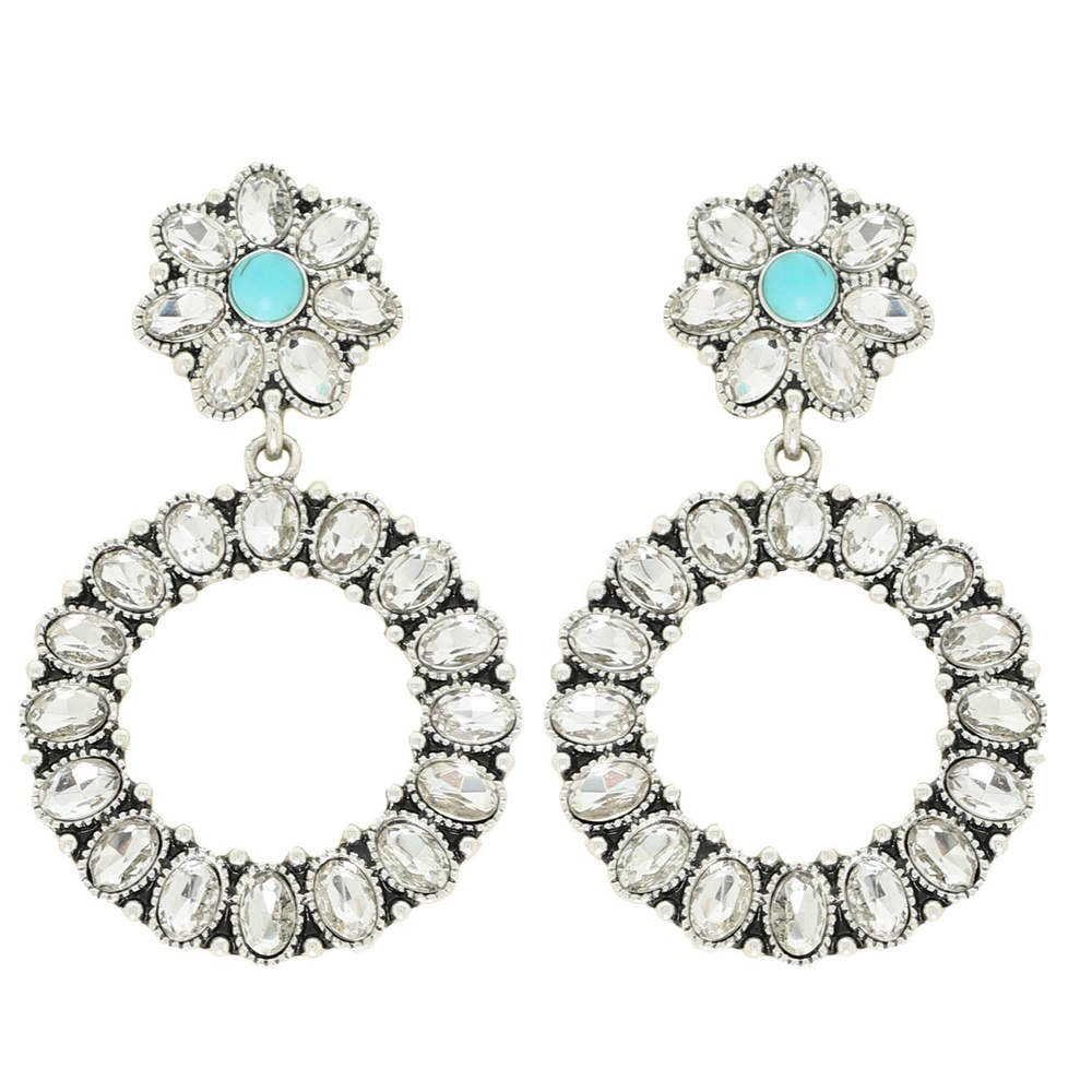 2-TIER WESTERN AB CRYSTAL GEMSTONE AND TURQUOISE SEMI STONE FLORAL OPEN CIRCLE LONG DROP EARRINGS IN OXIDIZED SILVER TONE METAL