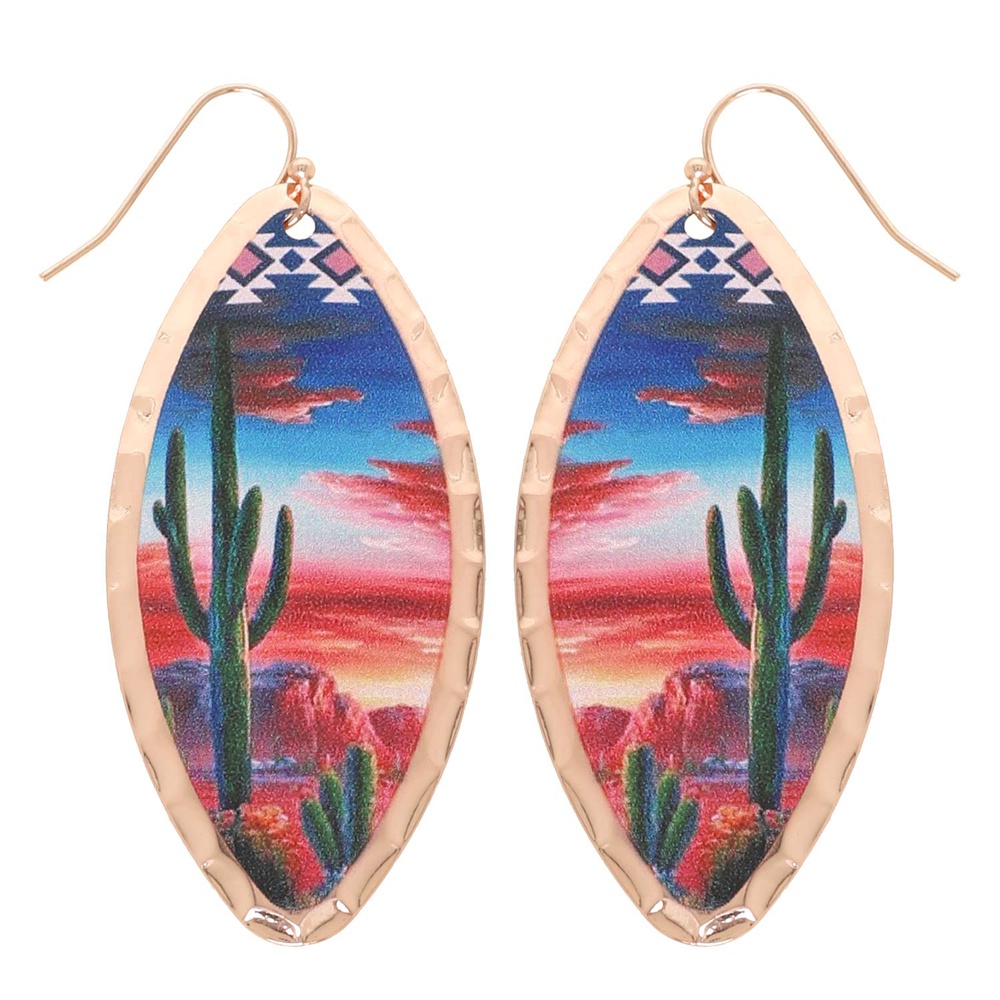 WESTERN WILD WEST DESERT LANDSCAPE PETAL SHAPED PRINTED FISH HOOK DROP EARRINGS COPPER TONE METAL