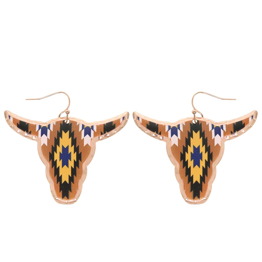 WESTERN NATIVE AMERICAN AZTEC DESIGN LONGHORN SHAPED PRINTED FISH HOOK DROP EARRINGS COPPER TONE METAL