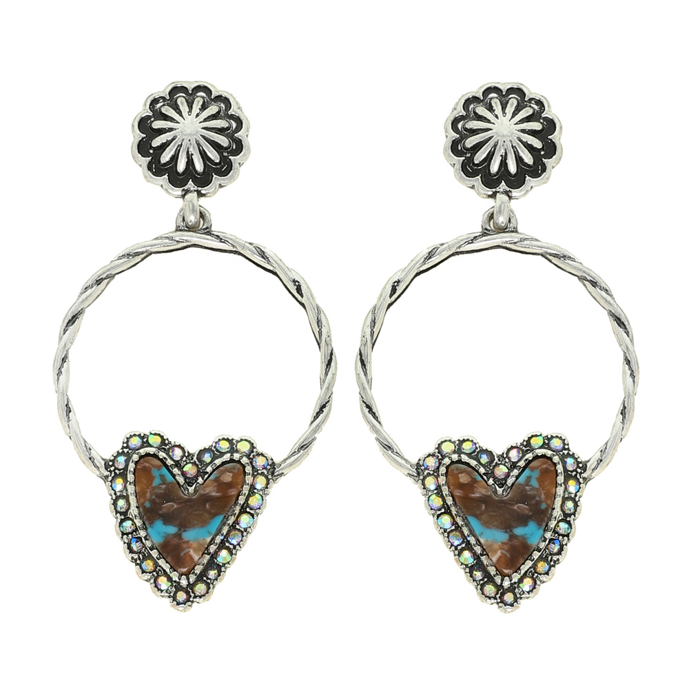 2-TIER WESTERN AB CRYSTAL RHINESTONE TURQUOISE SEMI STONE HEART OPEN CIRCLE DROP EARRINGS IN OXIDIZED SILVER TONE METAL