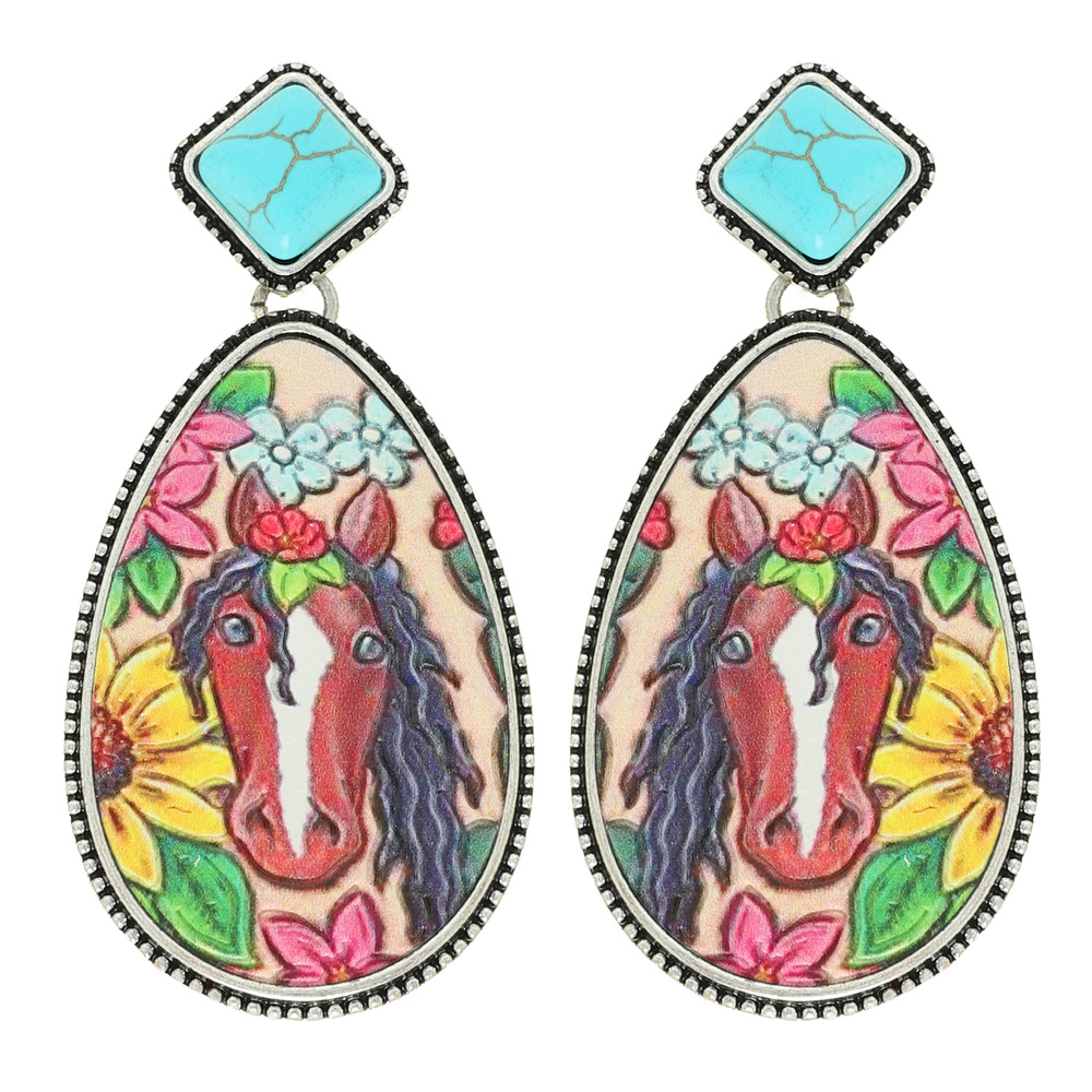 2-TIER WESTERN FLORAL HORSE TURQUOISE SEMI STONE TEARDROP PRINTED DROP EARRINGS OXIDIZED SILVER TONE METAL