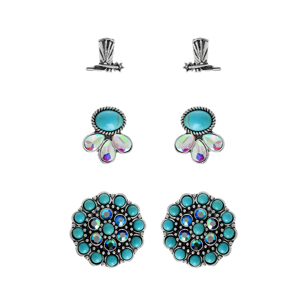 WESTERN BOHO THEME MOTIF CRYSTAL RHINESTONE TURQUOISE HAND CRAFTED EARRING SET IN SILVER-TONE METAL