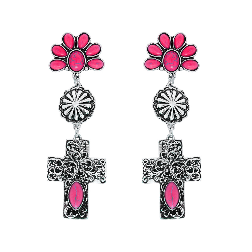 3-TIER WESTERN FLORAL SEMI STONE TURQUOISE FILIGREE CROSS DROP POST EARRINGS IN OXIDIZED SILVER TONE METAL