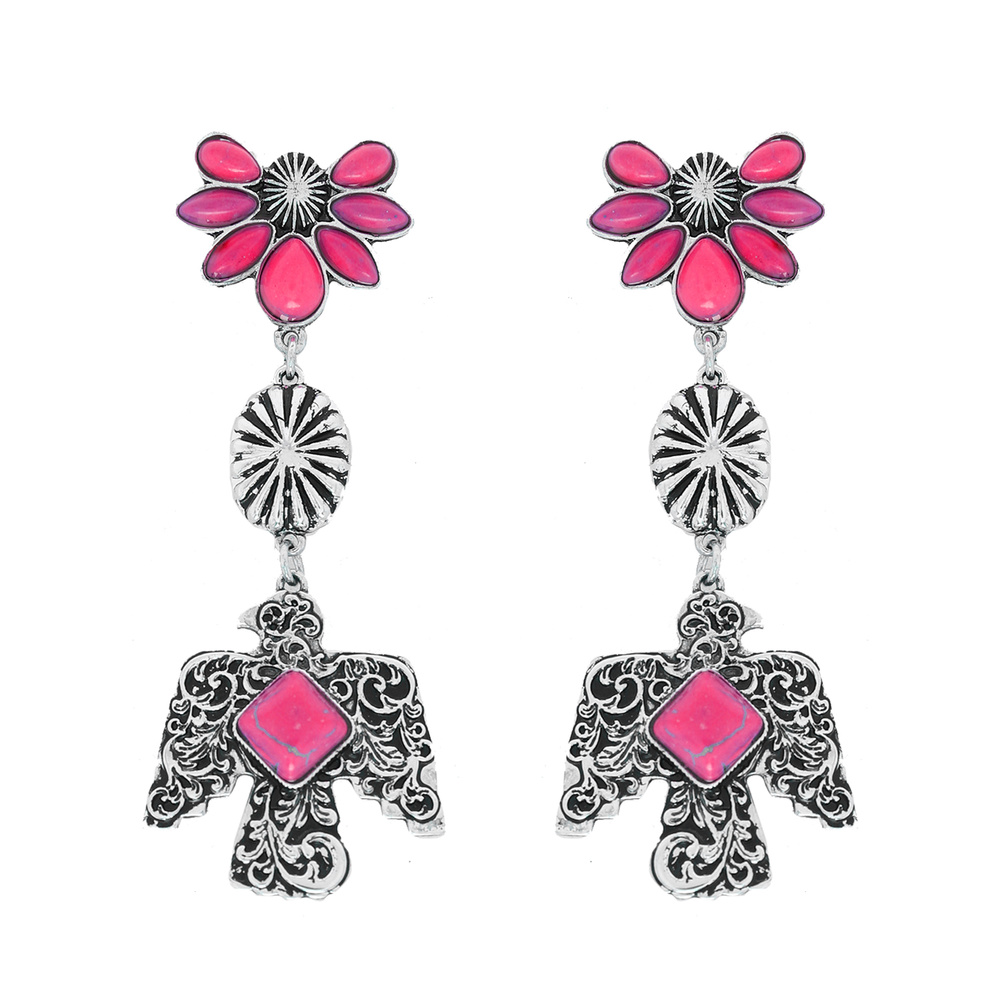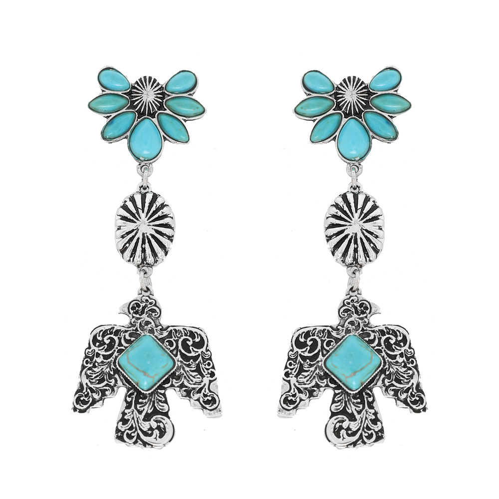 3-TIER WESTERN BOHEMIAN CONCHO TURQUOISE FILIGREE BIRD DROP POST EARRINGS IN OXIDIZED SILVER-TONE METAL