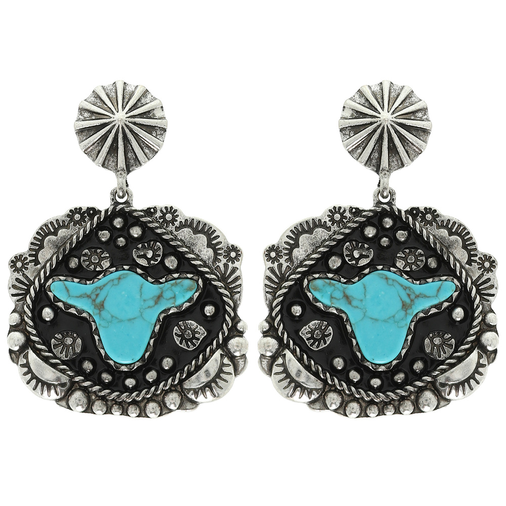 2-TIER FLORAL TURQUOISE COW HEAD SCROLLED CONCHO EARRINGS